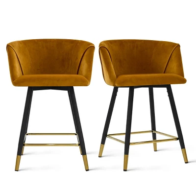 Chic modern style shines bright with the unique design of the Chole Fixed-Height Counter Stool by The Pop Maison. The bucket seats with a rounded and backrest, sleek upholstered armrests, carry with metal frame,it’s the perfect piece for your contemporary bar area. Plus, these stools have a circular aged gold footrest built in to give you a stylish spot to rest your feet. The Chole Counter Stool has smooth 360° swivel capability with lush velvet upholstery. Available in various bold colors.