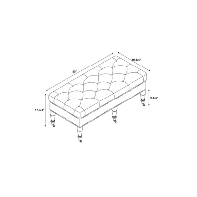 Evoking elegance, the Isabelle Bench is having a timeless design that will easily complement traditional and transitional homes. Upholstered in a Linen fabric, the bench is accented with designer details such as nail heads and beautifully finished legs. The plush top makes sitting comfortably. A classic addition to the end of the bed, entry, hall or under a large window. 50″ long