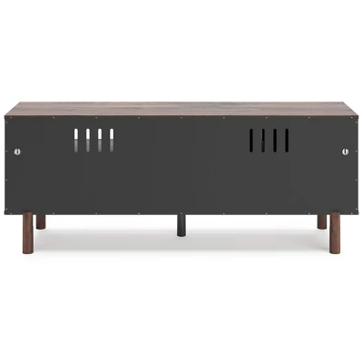 At the intersection of industrial cool and chic sophistication, you’ll find this TV stand. Its rich brown finish and burnished goldtone handles offer an authentic touch to your entertainment area. Easily house tech consoles, DVDs and games with an elegant two-door cabinet balanced with open shelving. The stand’s smooth-gliding drawer keeps living room clutter hidden while elevating your modern style. Signature Design by Ashley is a registered trademark of Ashley Furniture Industries, Inc..