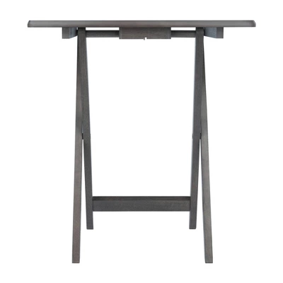 Make entertaining simple and easy with the Winsome Wood Dorian 5-Piece Snack Table Set. A perfect companion piece for a casual meal in front of the TV or on the patio. This versatile set includes four folding snack tables with oversized tops. The classic rectangular shape of these snack tables has gently curved sides, rounded corners and are oversized for more table space. Ideal for setting out appetizers, so bring out the set and pull up the tables as you and your guests sit back. Great for daily use and compact enough to store in the closet. For convenience an upright stand is an innovative addition to this set as it serves as a rack to store the folded tables discretely when not in use. Constructed of solid and composite wood in an oyster gray finish, this set of foldable tables easily open up to X-frame bases which make these table not only look good but also help with stability. Conveniently packed and shipped in 1 box. Tables arrive ready to use. Minimal assembly is required for the stand and hardware necessary is included. Replacement part request can be submitted directly to the manufacturer within 60 days from date of purchase.