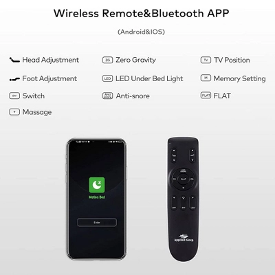 Upgrade your bed and find the perfect position for a great night’s sleep with the Applied Sleep Queen-Size Adjustable Bed Frame with Massage Zones and Bluetooth Control.This modern adjustable bed frame with a sleek design and premium features is a stylish addition to any bedroom. This adjustable frame features integrated back and legs massagers with 3 intensity levels that offer everything you could need for a perfectly restful night’s sleep. Including 4 USB ports for easy and hassle-free charging of devices with USB-compatible chargers, you can keep your favorite devices close at hand and ready to use.Decked out with features to make your life easier, this bed frame is fully controllable via the included wireless remote or by App on your own device. Independently adjust the head of the frame from 0-60 degrees and the foot from 0-40 degrees for unmatched personal comfort. Including an under-bed light and side pocket, this frame provides the ultimate comfort and ease. The preset zero-gravity, anti-snore, and memory positions make it easy to hop in bed and get cozy straight away.Enjoy a better night’s sleep with the Applied Sleep Queen-Size Adjustable Bed Frame with Massage Zones and Bluetooth Control.