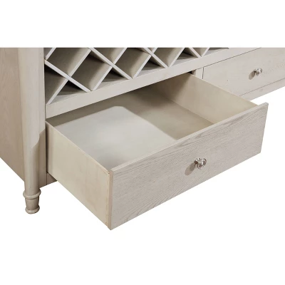 Allowing you to entertain with effortless elegance, the Hayes Counter Table complements any home. Featuring a gorgeous frost finish, the table offers a large tabletop and decorative turned legs. There is ample storage space with open shelving, a center divider to allow use of removeable 22 bottle wine storage or open space, and two large pass through drawers – all accessible from either side of the table.