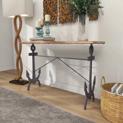 - ā¢Coastal console table features a rectangular top with metal anchor shaped base in a trestle style structure