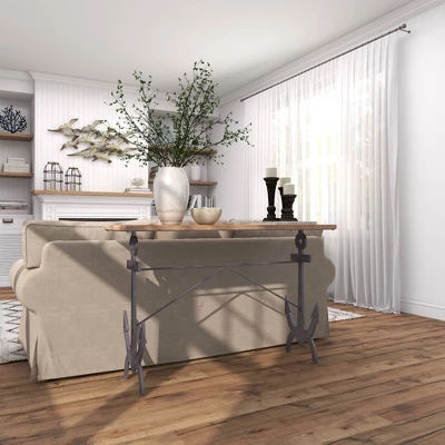 - ā¢Wood is sculpted and iron-forged legs are attached to the base to form a nautical console table design