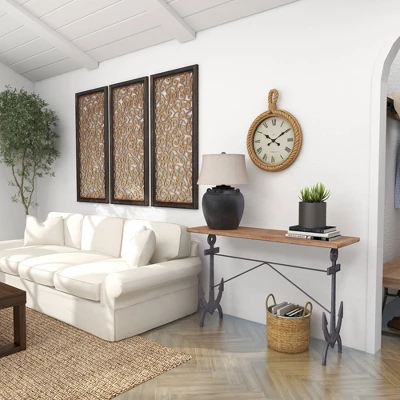 Bring a finishing touch to your home with an inviting appeal with this console table. A sturdy and long lasting construction for a years of enjoyment. Brown wood table is best to arrange in the entryway or living area with books topped with wood table lamp for a beachy appeal. Designed with felt or rubber stoppers at the base that prevent scratching furniture and table tops, as well as sliding around. This item ships in 1 carton. Suitable for indoor use only. Some assembly required. Maximum weight limit is 100 lbs. This is a single black colored entryway table. Coastal style.