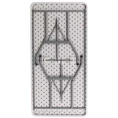 Rectangular folding tables are essential to anyone who setup displays to promote their products or hosts parties regularly. This 5′ long banquet folding table fits well in classrooms for team building exercises and computer lab work. The table can fit up to 6 people for collaborative learning sessions among students. This commercial grade folding table is often used in banquet halls, warehouses, conference centers, and at trade shows. Caterers will have ample space to layout meals for guests to be served, cover up with white linen for a professional appearance. Your floors remain scratch-free with the included protective floor caps. Once you’re done the legs lock underneath the tabletop to be transported and stored away. Easy to clean and store, plastic folding tables are the best and most popular option for any occasion. Although designed for indoor events this party table can be used outdoors on the deck or patio during good weather. Store the table indoors and protect the frame from extreme moisture. Get your ready to use rectangular folding table for your home or business today. Additional Features: Gray Powder Coated Locking Legs with protective floor caps
