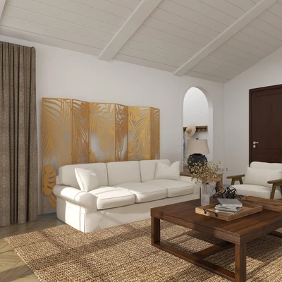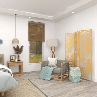 The best way to break uneven spacing in your home and create depth in a wide open floor plan. Bring a finishing touch to your home with an inviting appeal with this unique room divider. This room divider with striking botanical pattern provides a functional and unique design to keep your space balanced. This item ships in 1 carton. Suitable for indoor use only. This item ships fully assembled in one piece. Item features 3 panel screens. This is a single gold colored folding panel partition. Glam style.