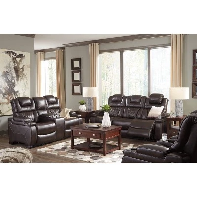 Your modern living room awaits with the Warnerton power dual-sided reclining loveseat. Complete with practical faux leather upholstery, one-touch power controls, adjustable headrests and USB ports, it makes finding the best seat in the house a breeze. Cup holders and a storage console keep drinks, snacks and remotes close by. Go ahead—treat yourself to a high-design home theater experience, priced to put you at ease. Signature Design by Ashley is a registered trademark of Ashley Furniture Industries, Inc. Dimensions: 72″W x 40″D x 44″H