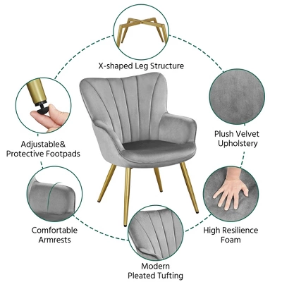 - Product Features: X-shaped leg structure, Adjustable & protective footpads, Comfortable armrests, Modern pleated tufting, High resilience foam, Plush velvet upholstery